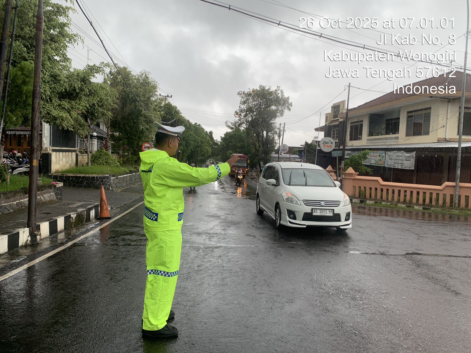 WONOGIRI — Satuan Lalu Lintas Polres Wonogiri tetap melaksanakan pengamanan dan pengaturan arus lalu lintas pada Selasa (3/3/2026) pagi meski diguyur hujan. Kegiatan yang dimulai pukul 06.30 hingga 07.30 WIB itu difokuskan di sejumlah titik rawan kepadatan di wilayah Kabupaten Wonogiri.