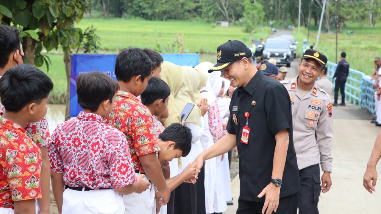 WONOGIRI – Renovasi Jembatan Kali Sambi di Dusun Mojosawit, Desa Tawangharjo, Kecamatan Giriwoyo, Kabupaten Wonogiri resmi diresmikan, Rabu (18/2/2026) pukul 08.30 WIB. Peresmian ditandai dengan pemotongan pita oleh Bupati Wonogiri bersama Kapolres Wonogiri dan dihadiri sekitar 100 orang dari unsur Forkopimda, TNI-Polri, OPD, perangkat desa, hingga pelajar dan warga setempat.