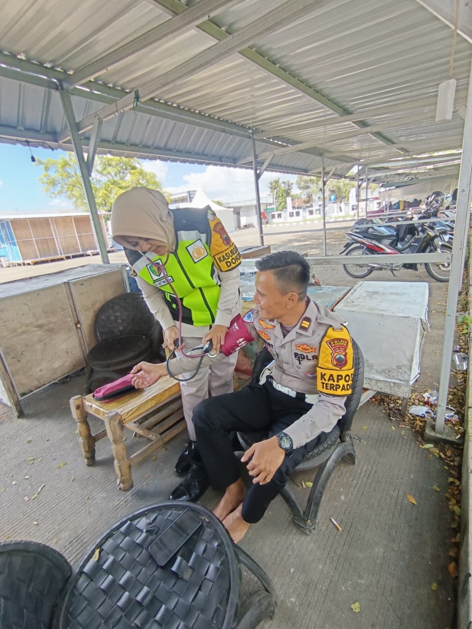 Dalam kegiatan tersebut, petugas melakukan pemeriksaan kesehatan berupa pengecekan tekanan darah (tensi) serta memberikan multivitamin kepada personel guna menjaga stamina selama menjalankan tugas pengamanan arus mudik dan perayaan Idul Fitri.