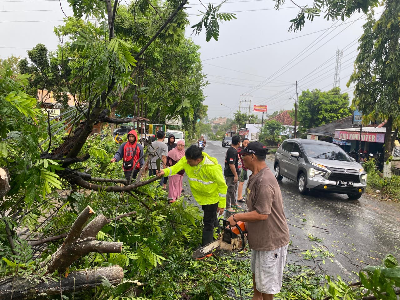 Wonogiri – Hujan lebat disertai angin kencang yang melanda wilayah Kecamatan Ngadirojo, Kabupaten Wonogiri, Sabtu (11/4/2026) sekitar pukul 14.00 WIB, mengakibatkan sejumlah pohon tumbang dan menimpa fasilitas umum serta rumah warga.