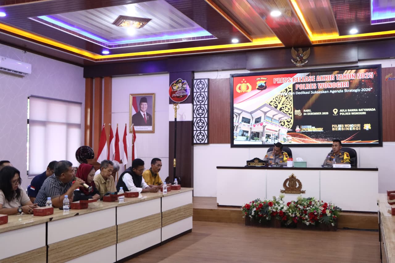 Wonogiri – Polres Wonogiri menggelar Press Release Akhir Tahun 2025 di Gedung Mapolres Wonogiri, Rabu (24/12/2025), sebagai bentuk transparansi dan akuntabilitas kinerja kepolisian kepada publik. Kegiatan tersebut memaparkan capaian Polres Wonogiri di bidang pemeliharaan keamanan dan ketertiban masyarakat (kamtibmas), penegakan hukum, keselamatan lalu lintas, serta pelayanan publik sepanjang tahun 2025.