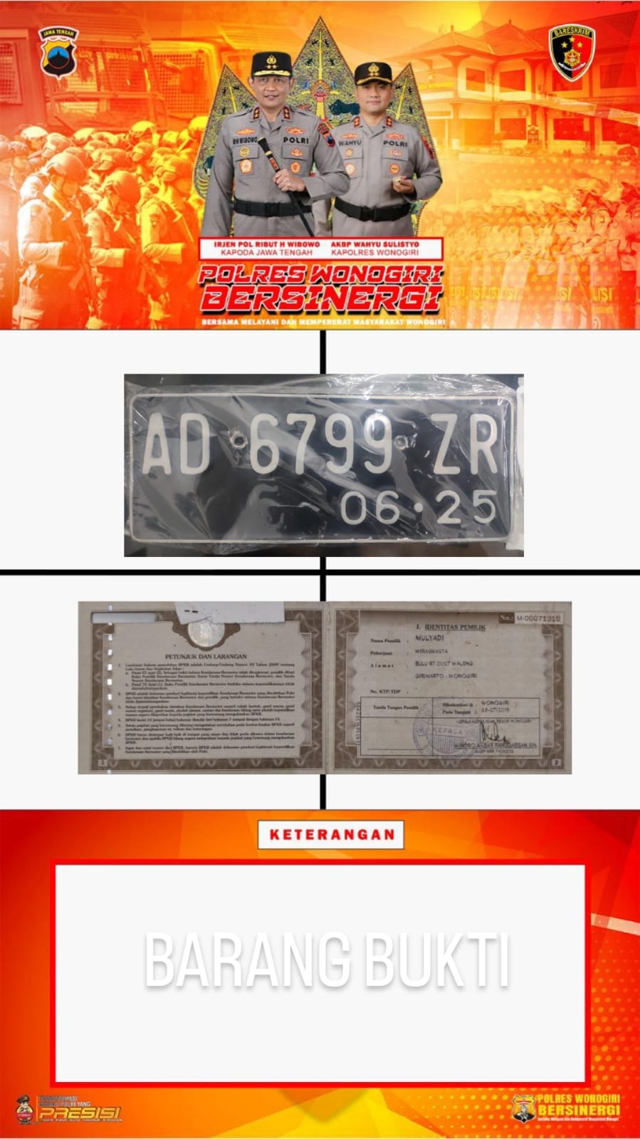 Dari tangan para pelaku, polisi berhasil mengamankan sejumlah barang bukti, di antaranya BPKB dan plat nomor kendaraan Honda GL 160 D dengan nomor polisi AD 6799 ZR atas nama Mulyadi, warga Girimarto, Wonogiri.