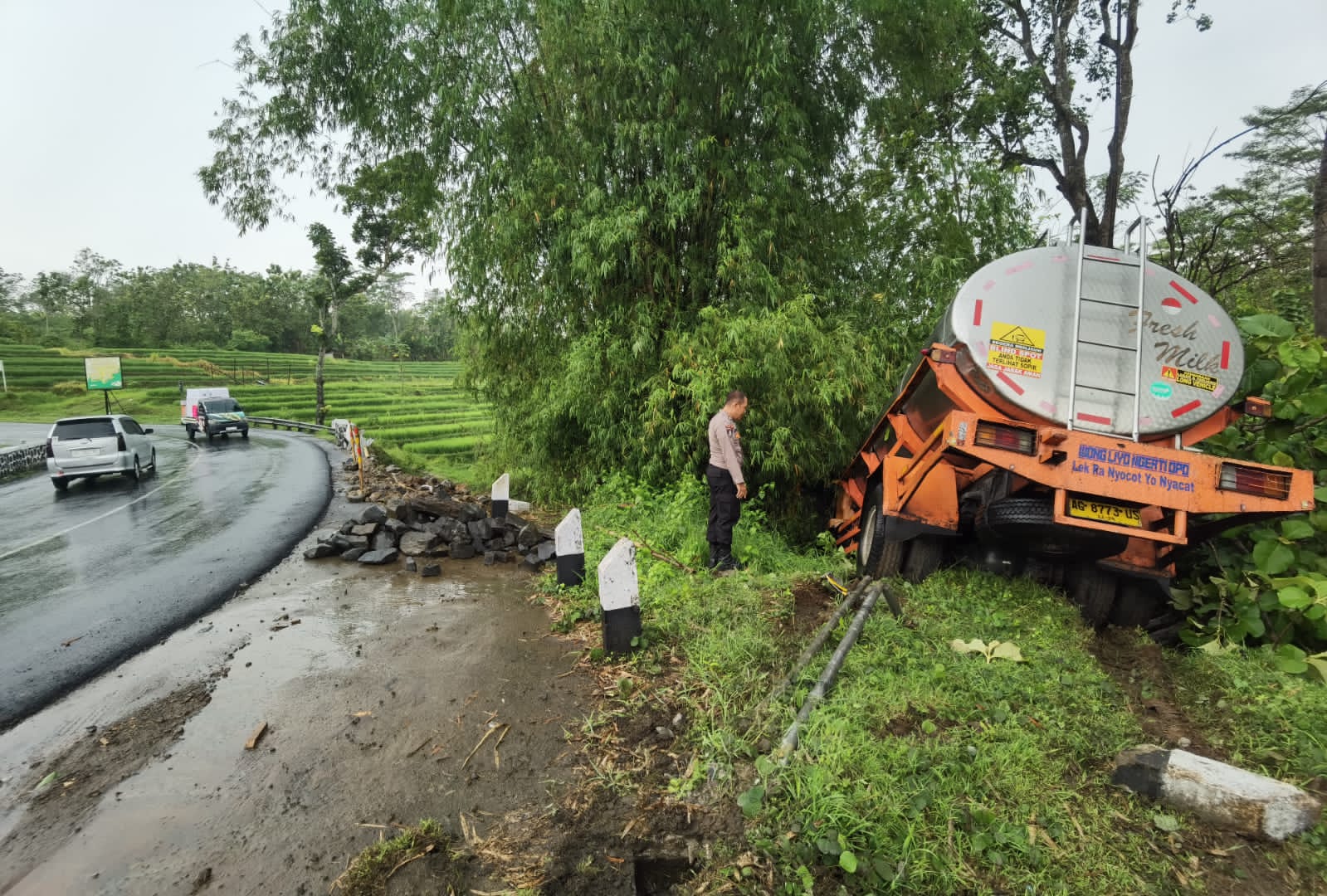 Wonogiri – Hujan deras yang mengguyur wilayah Kecamatan Sidoharjo, Kabupaten Wonogiri, Selasa (21/10/2025) siang, menyebabkan sebuah truk tangki susu warna oranye bernomor polisi AG 8773 US mengalami kecelakaan tunggal di ruas Jalan Ngadirojo–Wonogiri-Ponorogo, tepatnya di tikungan Irung Petruk.