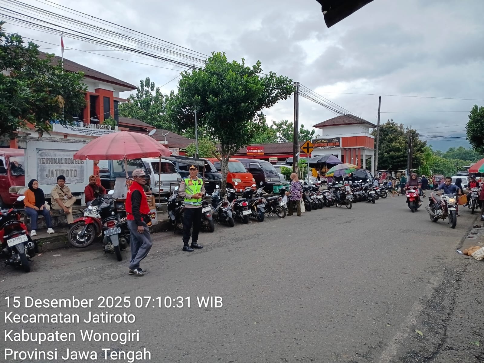 Wonogiri — Polsek Jatiroto, Polres Wonogiri, melaksanakan pengamanan (pam) kegiatan Pasaran Legi di Terminal Non Bus Jatiroto, Senin (15/12/2025) pagi. Pengamanan dimulai pukul 07.00 WIB hingga selesai guna memastikan kelancaran aktivitas masyarakat dan situasi keamanan tetap kondusif.