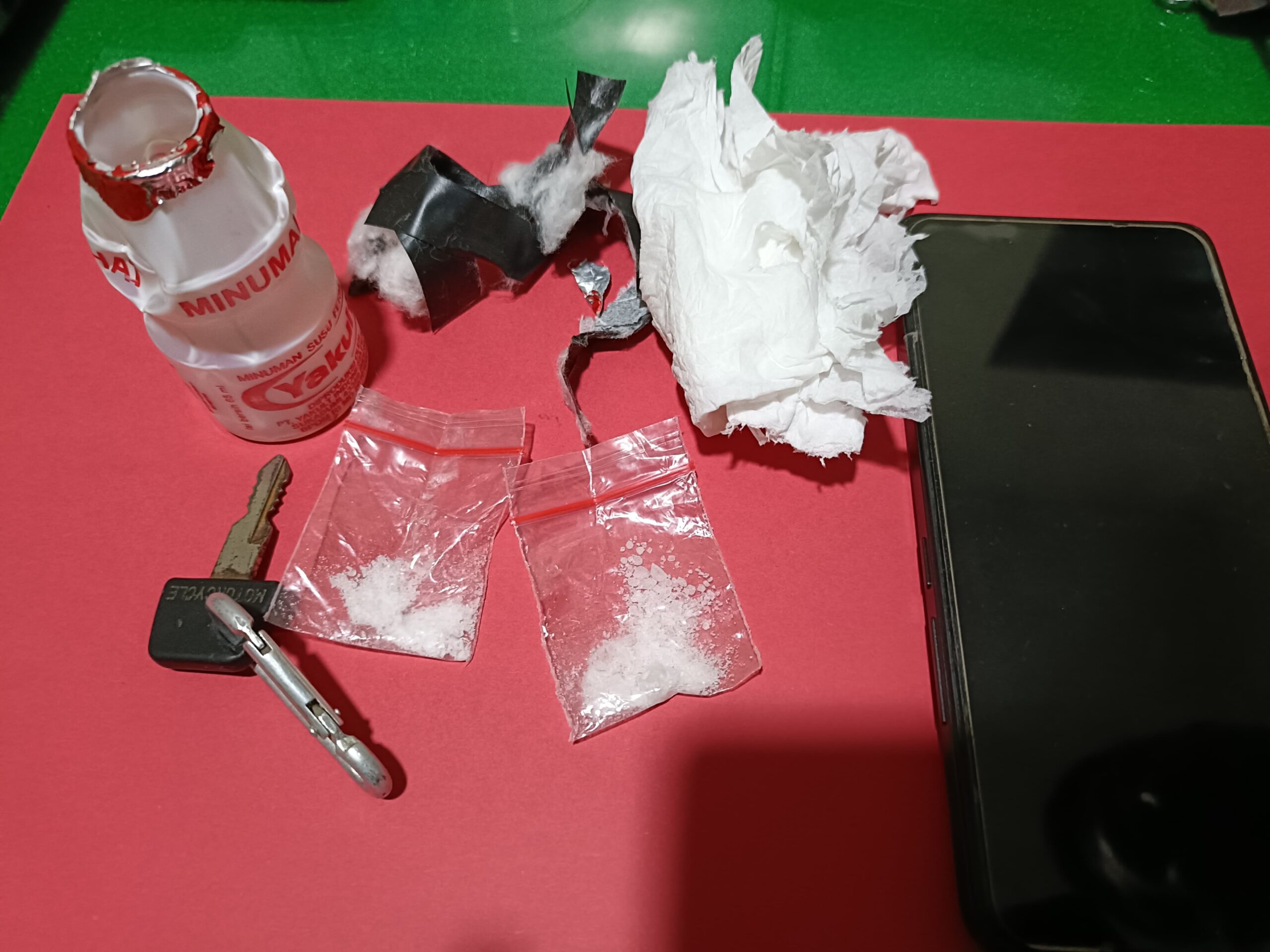 Saat dilakukan penggeledahan, polisi menemukan dua plastik klip berisi sabu dengan berat bruto 1,8 gram. Barang haram itu dibungkus kapas dan dililit plester warna hitam di dalam botol minuman probiotik.