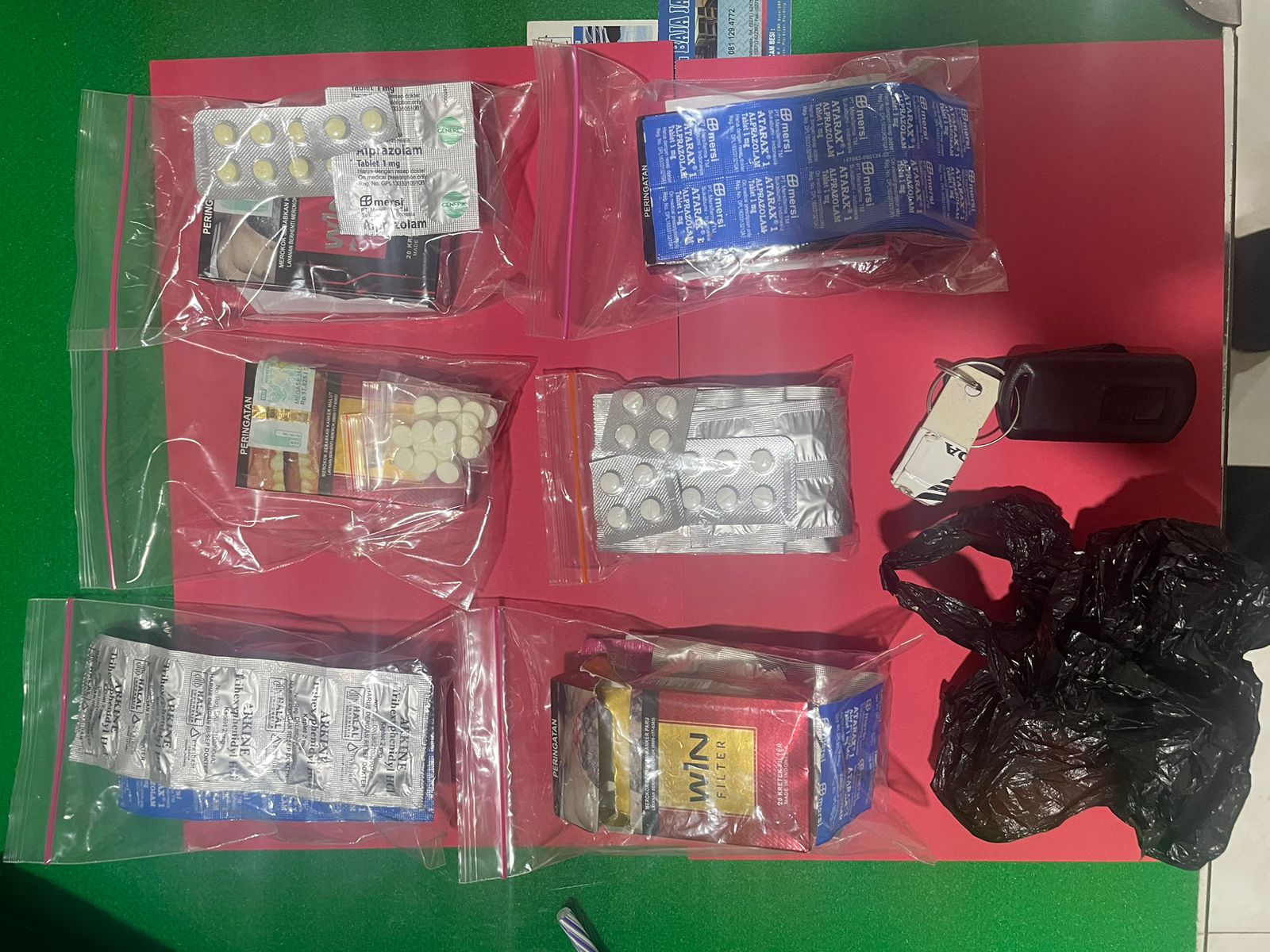 Dari pengungkapan tersebut, polisi mengamankan berbagai barang bukti berupa berbagai jenis pil psikotropika dan obat daftar G dengan jumlah puluhan butir, beberapa bungkus rokok yang digunakan sebagai tempat penyimpanan obat, tiga buku catatan medik, dua unit telepon seluler, sebuah tas hitam, serta satu unit sepeda motor Honda Vario 150 bernomor polisi AD 5868 QR.