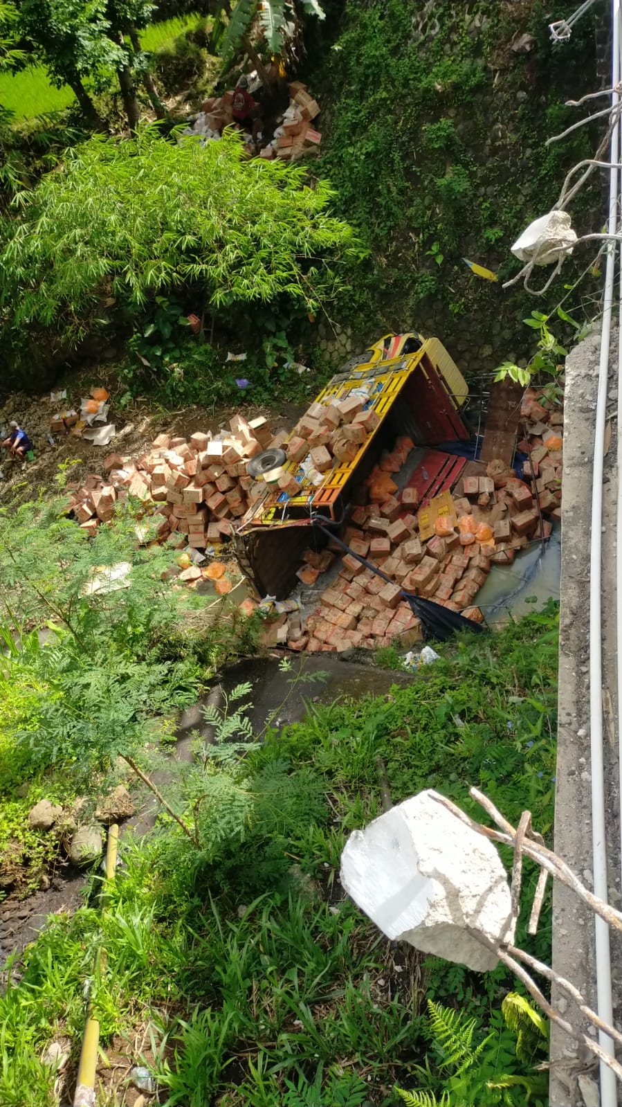 Berdasarkan keterangan di lapangan, pengemudi diduga mengantuk saat melintas di jembatan sehingga tidak mampu mengendalikan laju kendaraan. Akibat kejadian tersebut, truk terperosok ke sungai di sisi kiri jembatan dan muatan snack yang dibawanya berhamburan.